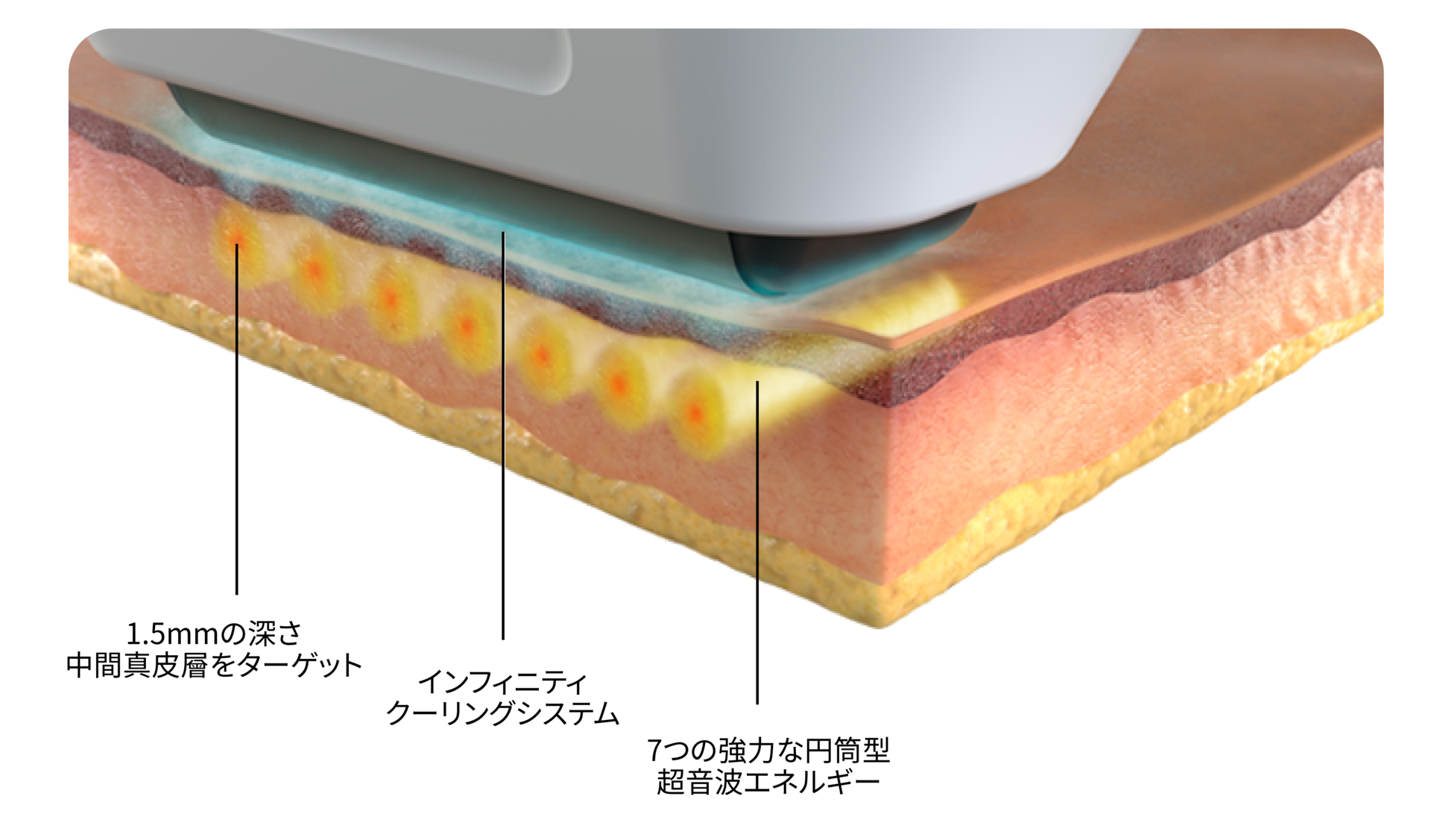 SUPERB技術で1.5mmの深さまでコラーゲンを再生し、ハリと滑らかな肌へ導きます。クーリングシステムにより、頬がこけることなく快適な施術が可能です。