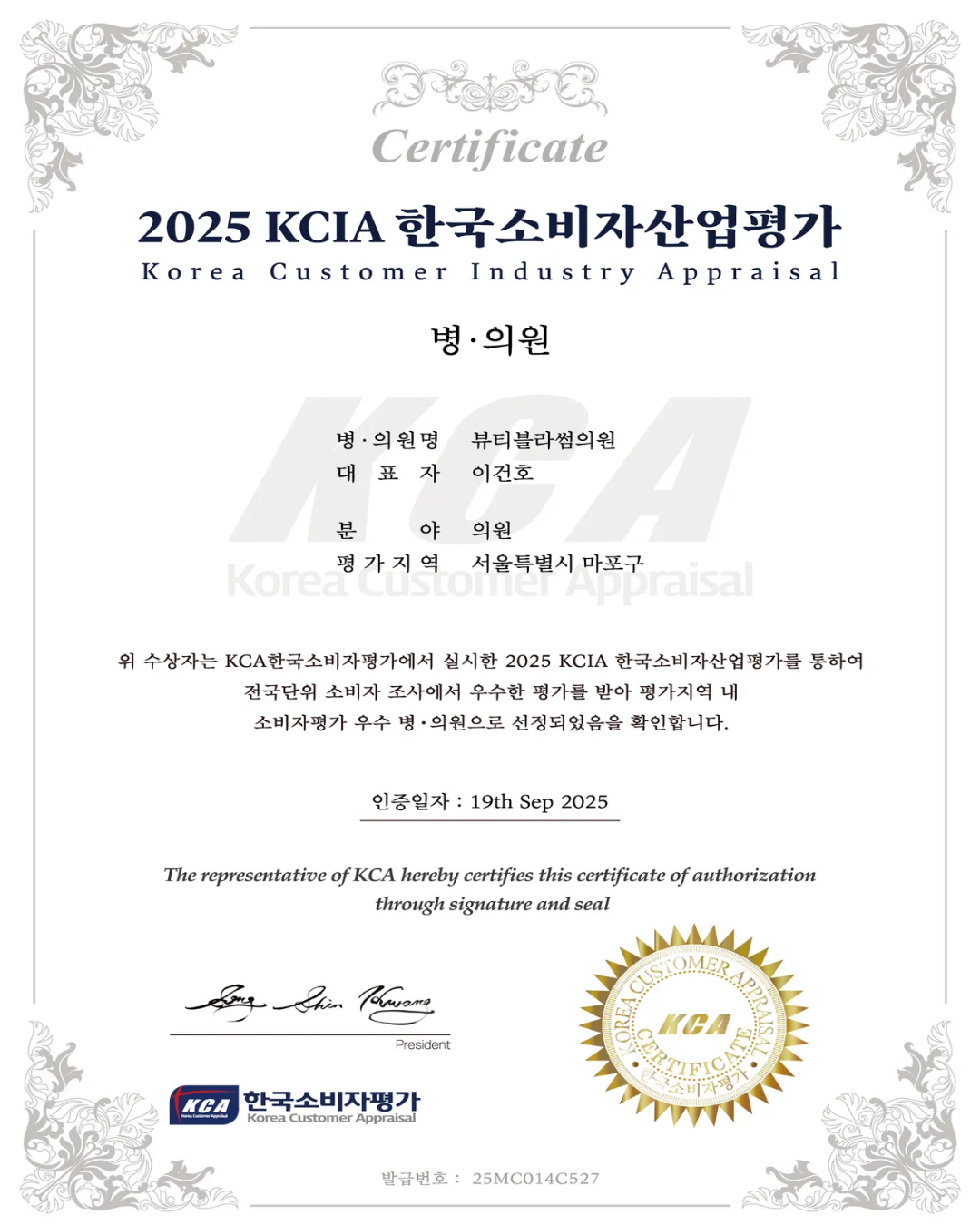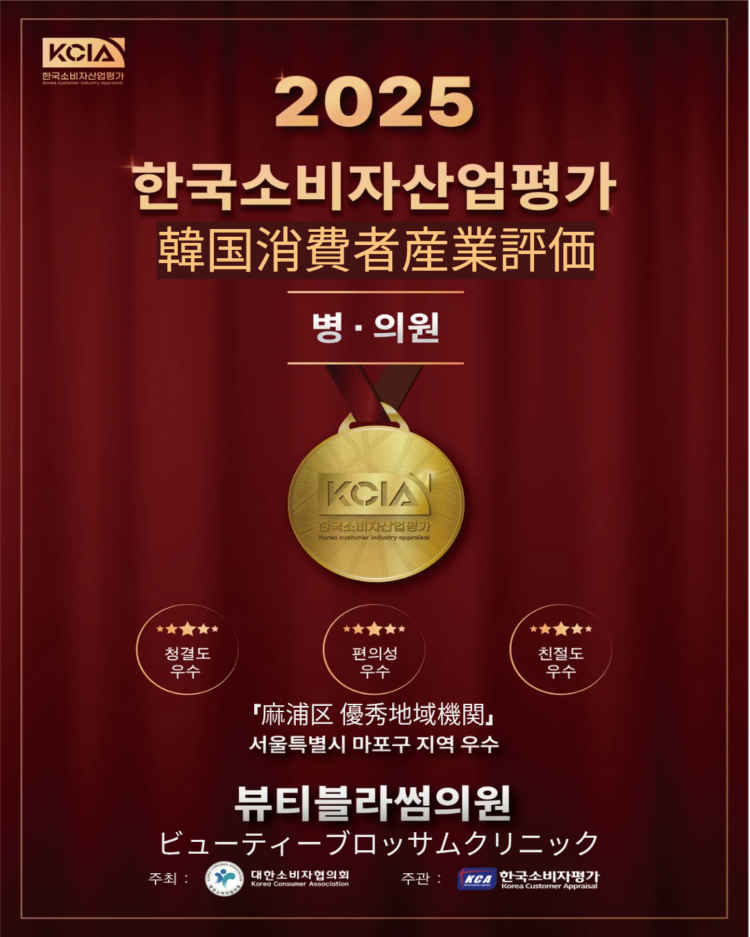Beauty Blossom Clinic が、2025年 韓国消費者産業評価「麻浦区 優秀病院」 に選ばれました。