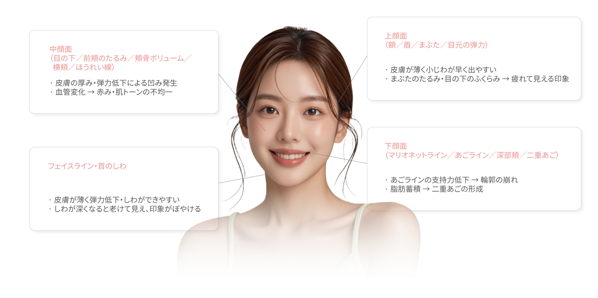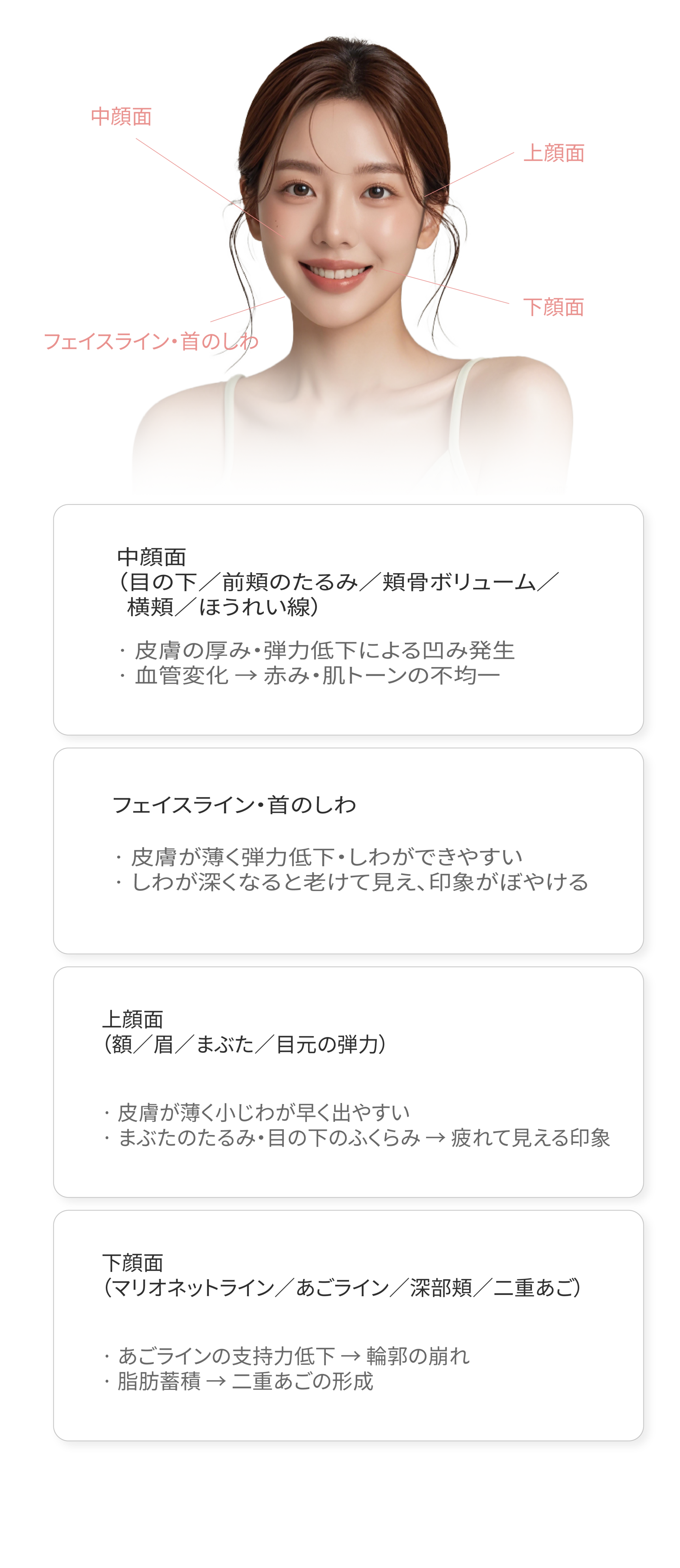 老化は単にしわができる現象ではなく、部位ごとに異なる原因とメカニズムが複合的に作用する過程です。