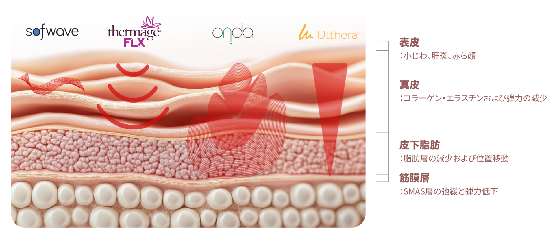 各層は老化の様相や構造的変化が異なるため、それに対応するエネルギー機器や治療方法も変わる必要があります。